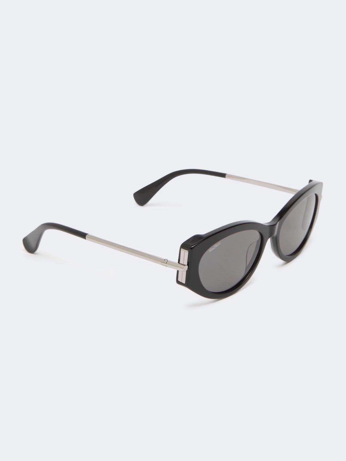 Sunglasses with an oval acetate front, distinguished by a clean design and a metal insert on the side that connects the front to the temple, accentuating the purity of the lines.